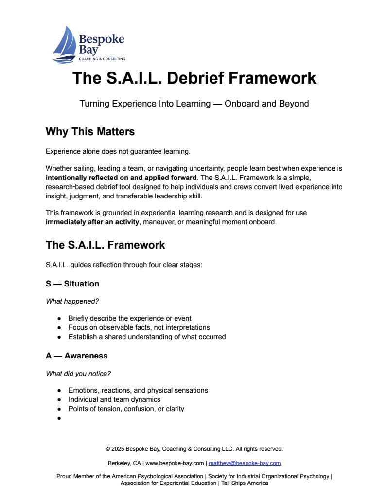 It’s grounded in Dr. David A. Kolb’s experiential learning theory but designed specifically for deckhands, captains, educators, and youth programs who are already doing extraordinary work and want to make learning more visible, transferable, and measurable.