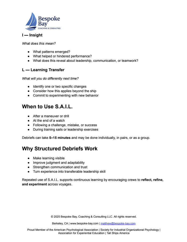 At the conference, I introduced a simple debrief model I’ve developed called the S.A.I.L. Framework: